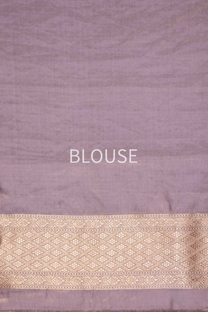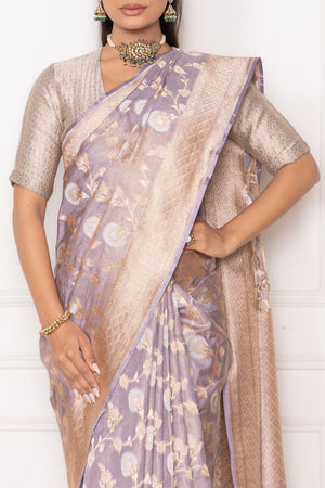 In a graceful shade of mauve, this katan tissue saree is a portrait of delicate opulence and refined charm. The silk-tissue fabric shimmers with a soft, translucent glow, lending an airy grandeur to its every fold.