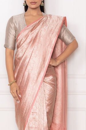 In a delicate shade of peach pink, this katan silk saree radiates soft grandeur and feminine grace. The lustrous silk glows with a warm, luminous sheen, creating a canvas of quiet richness.