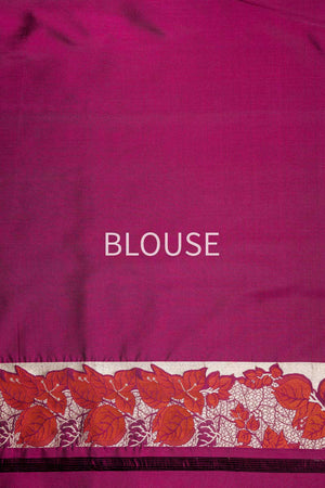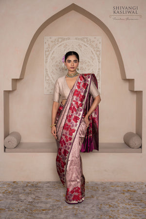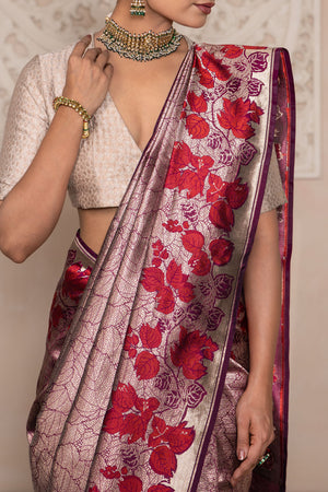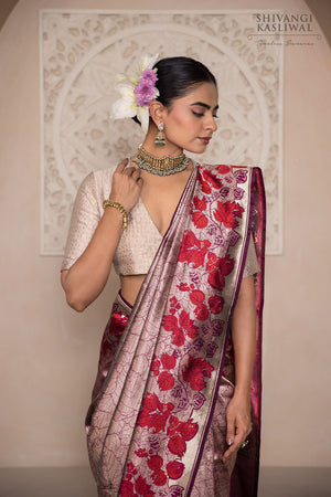 Framing this ethereal drape is a striking red open border, adorned with leaf motifs that echo the saree’s central theme. The bold contrast enhances its elegance while anchoring the design in classic Banarasi tradition.