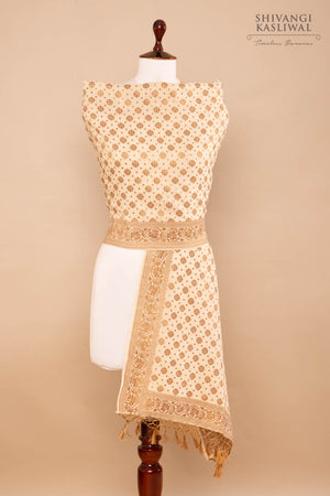 • A sumptuous beige Banarasi moonga silk stole, lavishly embellished with an all-over floral buti pattern, shimmering softly in antique zari. This masterpiece of artistry captures the essence of old-world charm.