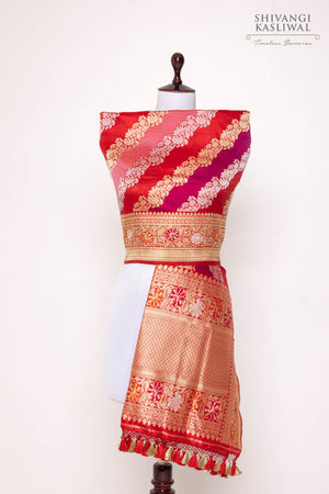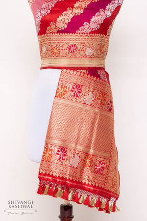 Executed in the intricate rangkaat technique—where each hue is meticulously woven in isolation across the warp—this masterpiece is a showcase of precision and mastery. Every motif gleams like a jewel, rendering the dupatta a true heirloom and a timeless symbol of luxury.
