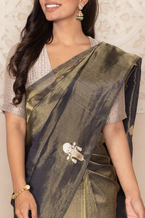 Dramatic and timeless, this handwoven Banarasi saree in deep black is a true statement of elegance. Crafted in lustrous tissue silk, it shimmers with a soft, incandescent glow that elevates its regal charm.
