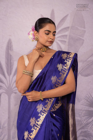 A resplendent celebration of Banarasi artistry, this navy blue pure silk saree embodies radiant opulence. The expanse of silk is adorned with luminous booti motifs, glistening like scattered stars across a midnight sky. Along the satin-woven border unfolds a majestic narrative—graceful deer in repose beneath soaring palm trees, evoking scenes of serene grandeur. Woven with masterful intricacy, this heirloom drape is an ode to timeless magnificence and regal allure.