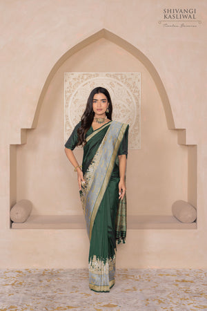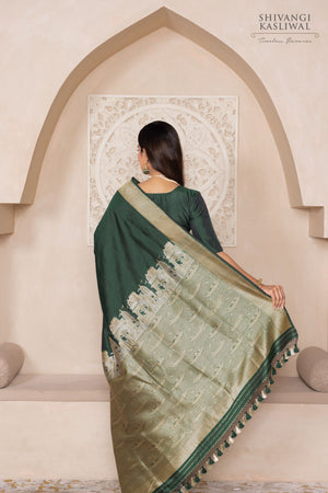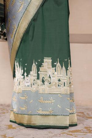 In a regal bottle green, this katan silk saree is framed by a breathtaking border depicting the sacred ghats of Banaras, rendered in gleaming gold and silver zari. Woven in the revered kadhua technique, every inch echoes with cultural splendour and masterful artistry—a luxurious homage to the soul of the city, timeless and resplendent.