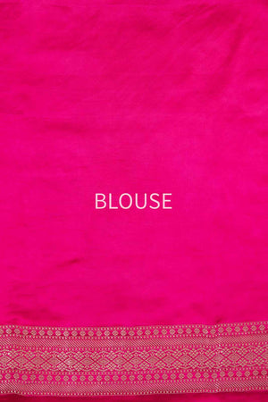 Resplendent in the brilliance of fuchsia pink, this gajji silk saree is a radiant testament to Banarasi grandeur. Its lustrous expanse gleams with the richness of gold zari, woven in the time-honoured kadhua technique that lends depth and permanence to every motif. The traditional border unfolds with regal intricacy, its design glowing in zari against the vibrant silken canvas, exuding heritage at its most refined.