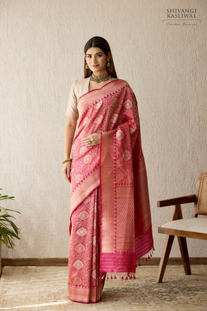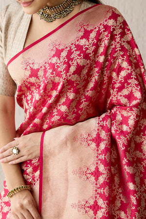 Unveiling the hidden stories of Banaras with every meticulously woven thread, this opulent handwoven masterpiece, crafted by generations of master artisans, captivates the senses. Set against a regal canvas of fuchsia pink Katan silk, it showcases traditional gold zari in a resplendent brocade weave, beautifully enhanced by an intricate jaal pattern. Exquisitely designed, inherently radiant, and eternally classic, this saree enchants with an irresistible, timeless allure.