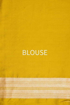 Bathed in the radiance of a greenish-yellow hue, this Katan silk Banarasi saree exudes a brilliance reminiscent of sun-kissed royalty. A magnificent palm-tree jaal, sculpted in opulent gold zari, stretches across the silk like an enchanted oasis—each leaf rising with poised grandeur, each detail woven with impeccable artistry. Blush-pink resham accents crown the palms, adding a sublime flourish that lends both romance and regality to the tapestry.