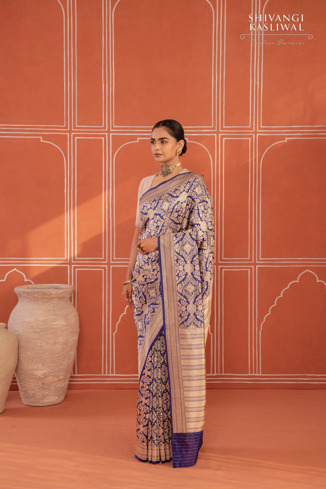 In the sovereign depth of navy blue, this Katan silk Banarasi saree radiates uncompromising luxury. A grand floral jaal in pure gold zari unfurls across the body, its artistry bold and meticulously refined. The rich sheen of the silk heightens the brilliance of the gold, creating a drape that commands admiration with every movement.