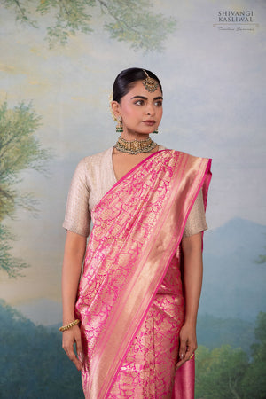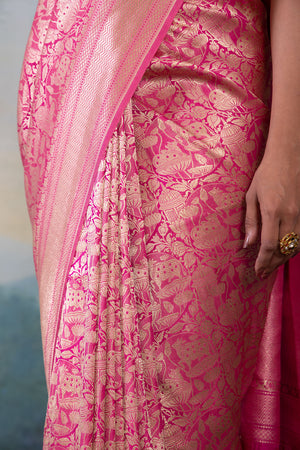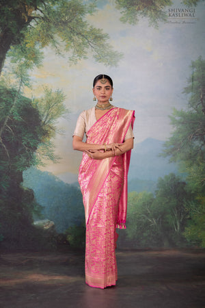 The luminous contrast of molten gold against the radiant pink silk lends the drape an aura of majesty and sanctity, transforming it into a canvas of storytelling woven with finesse. More than a saree, it is a masterpiece that unites opulence with cultural reverence—crafted for the connoisseur who seeks beauty that is eternal, symbolic, and resplendent in every thread.