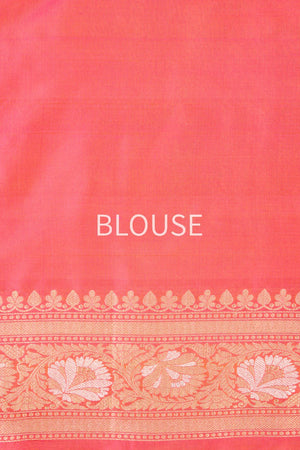 In a vibrant fusion of pink and orange, this katan silk Banarasi saree radiates a warm, radiant glow that captures the essence of luxury and celebration. Adorned with an exquisite floral jaal, the intricate minakari work dances across the fabric, complemented by the dazzling shine of gold & silver zari. The design, woven with unparalleled precision, showcases the mastery of Banarasi artisans, with each thread speaking to the rich heritage of this timeless craft. The saree’s soft, luxurious texture and graceful drape make it a perfect embodiment of refined elegance, destined to be cherished and passed down through generations.