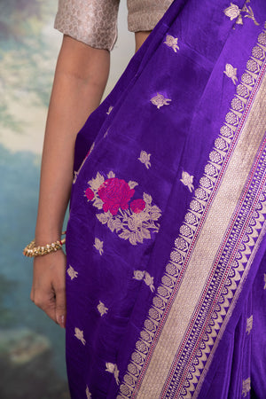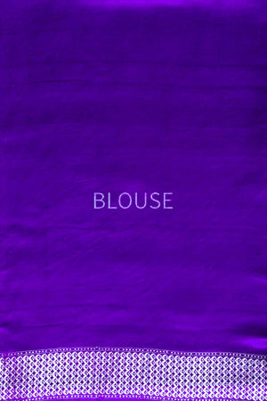 • Draped in the regal mystique of purple, this gajji silk saree exudes an opulence that is both commanding and timeless. Its lustrous expanse is embellished with floral boota motifs, brought to life through the exquisite precision of the kadhua weave. Woven in glowing gold zariand accented with delicate hints of pink meenakari, each motif gleams like a treasured jewel upon the sumptuous silken ground, radiating unmatched refinement.