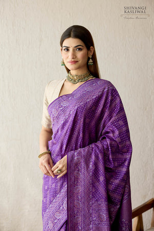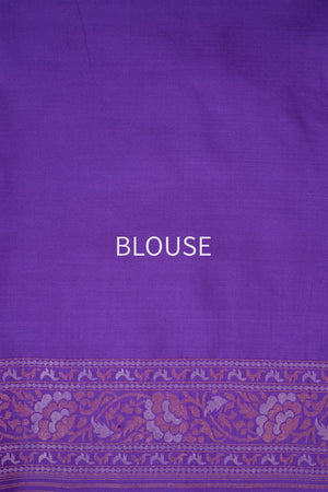 As deep and enchanting as a twilight garden, this purple ektara silk saree exudes a regal allure. The saree is adorned with the intricate Arra Jaal pattern, meticulously woven in shimmering sona-rupa zari, reflecting the mastery and devotion of its weaver. This piece is a heartfelt tribute to the rich heritage of Banaras, capturing the essence of tradition and sophistication in every detail. Wrap yourself in this exquisite drape, where each motif tells a story of elegance, making it a symbol of timeless beauty and refined grace.
