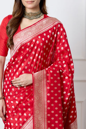 Exuding unparalleled opulence, this Banarasi saree is a masterful creation in the finest katan silk. Set against a captivating red backdrop, it is adorned with radiant gold butis, each one meticulously handwoven by skilled artisans to achieve perfection in every detail. The luxurious fabric drapes effortlessly, offering a soft, indulgent feel against the skin, while the rich design speaks of timeless elegance and refined beauty. A true work of art, this saree is destined to leave a lasting impression with its stunning flow and regal charm.