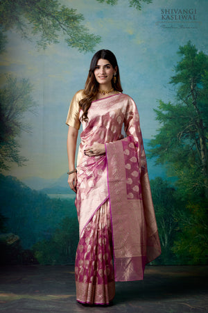 Step into the world of contemporary sophistication with our pink Banarasi tissue silk saree. Featuring a striking floral buta patten, this saree offers a modern twist on timeless elegance, seamlessly blending tradition with a bold, contemporary edge.