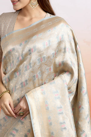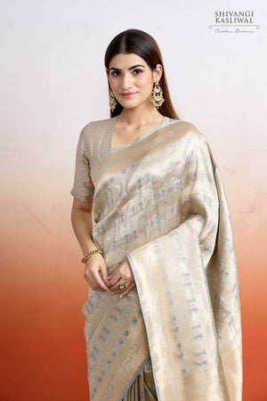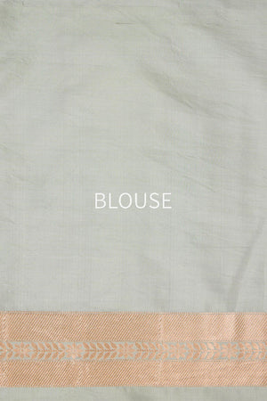 • In a serene powder blue hue, this Katan silk Banarasi saree exudes exquisite elegance through its masterful craftsmanship. Adorned with a captivating jaal pattern in basket weave, the saree shimmers with resplendent gold zari, further enhanced by the allure of pink mina. This handwoven marvel embodies the grandeur of Banarasi artistry, offering a timeless charm and unmatched sophistication. It is a treasured masterpiece, destined to become a cherished gem in your collection.