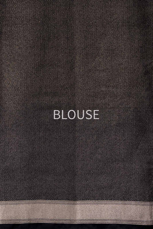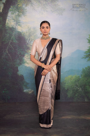 The inky-black ground magnifies the metallic radiance, casting a spell of luminous contrast and regal intensity. Woven with rare mastery, this saree embodies dark opulence—an heirloom creation where tradition and geometry converge in an aura of enduring magnificence.