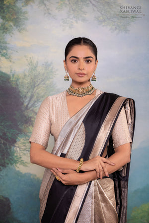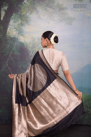 An opulent symphony in black, this pure katan silk saree is a radiant testament to Banarasi grandeur. Across its lustrous expanse emerge magnificent circular medallions—majestic orbs that command attention with their scale and splendour. Within each, intricate geometric patterns unfold like treasures of design, meticulously handwoven in resplendent gold and silver zari. The interplay of bold form and delicate detail creates a mesmerising cadence, echoing both timeless heritage and architectural brilliance.