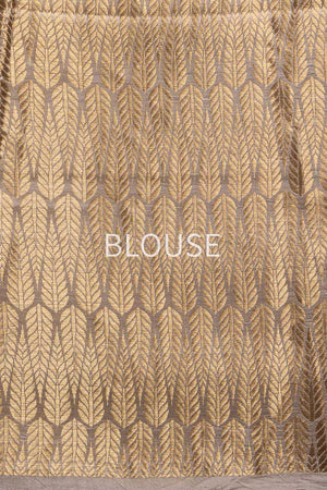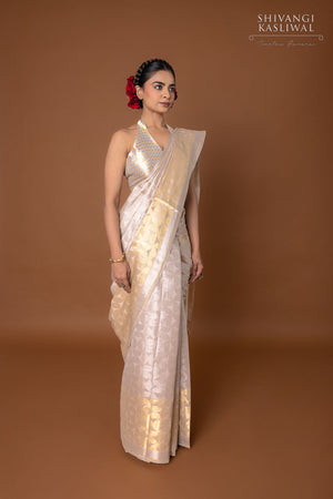 Ethereal and arresting, this off-white silk saree captures the essence of quiet luxury. Embellished with intricate geometric motifs in antique gold and silver zari, it glimmers with a soft, aged lustre that evokes timeless sophistication. The interplay of muted tones and precise craftsmanship creates a drape that feels both contemporary and steeped in heritage a refined statement for those who appreciate nuanced elegance.