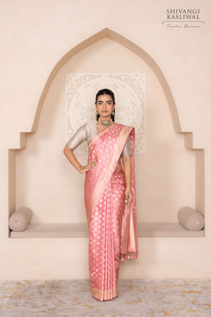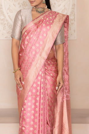Bathed in a luminous shade of pink, this Banarasi saree is an ode to timeless charm and regal finesse. The body is adorned with dainty polka dots in gold zari, scattered like golden blossoms across a bed of silk. Each motif gleams with delicate brilliance, lending the drape an air of quiet luxury and vintage elegance.