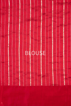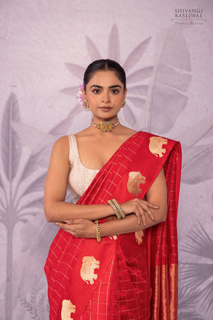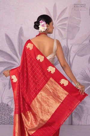 Draped in the timeless grandeur of red, this pure silk saree is a radiant vision of heritage and power. The silken body glows with a refined grid of checks, each line shimmering in lustrous gold zari, creating a tapestry of regal brilliance. Along the border, the stately elephant stands resplendent in zari, a symbol of strength, majesty, and prosperity. Exquisitely woven, this masterpiece of Banarasi artistry embodies opulence in every thread—an heirloom of enduring elegance and imperial grace.