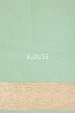 A masterpiece crafted by skilled kaarigars with a rich heritage of traditional Banarasi weaving techniques, this mint green handwoven Banarasi georgette saree is a labor of love. Inspired by the lushness of a forest landscape, it embodies an evergreen elegance. The saree features rustic shikargah motifs, historical designs depicting hunting scenes that reflect a timeless tradition. Its pastel-hued drape evokes the essence of intricate artistry and enduring heritage.