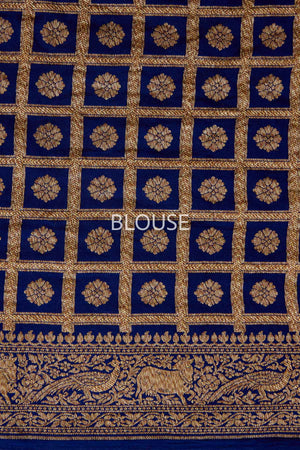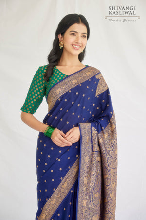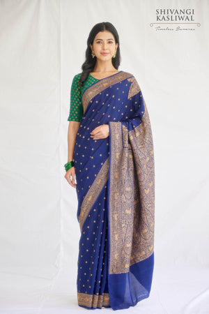 A navy blue crepe silk saree with small butis, shikargah border and paisleys or konia near the palla, woven in antique zari.