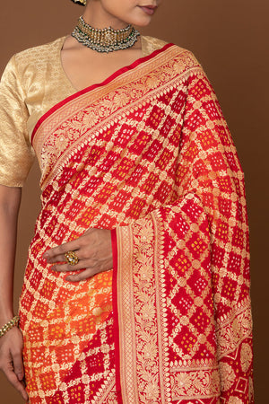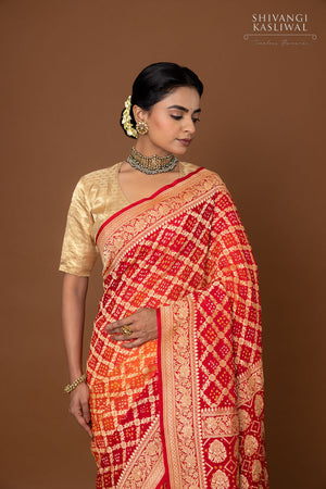 Bold and radiant, our red-orange handwoven Banarasi bandhani saree captures the spirit of celebration in every thread. The fiery blend of hues is brought to life with intricate bandhani work, each motif tied by hand with remarkable precision. Accented with luxurious Banarasi weaving and glimmering gold zari, the saree strikes the perfect balance between tradition and grandeur. With its luminous drape and artisanal charm, it’s an unforgettable choice for weddings, festive rituals, and statement-making occasions.