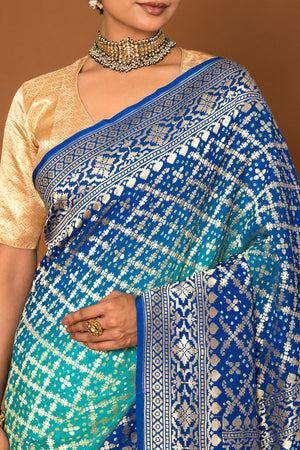 Embrace sophistication in our shaded blue handwoven Banarasi bandhani saree, where subtle hues blend with exquisite hand-tied bandhani motifs. Crafted with the finest Banarasi weaving and enhanced with opulent gold zari, this saree radiates timeless allure. The luxurious texture and intricate artistry elevate its appeal, transforming it into a true masterpiece. With its graceful drape and refined charm, it’s an ideal choice for weddings, grand celebrations, and moments of heritage.