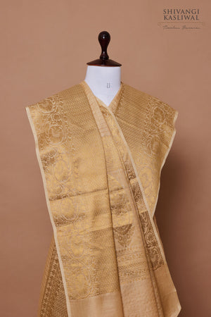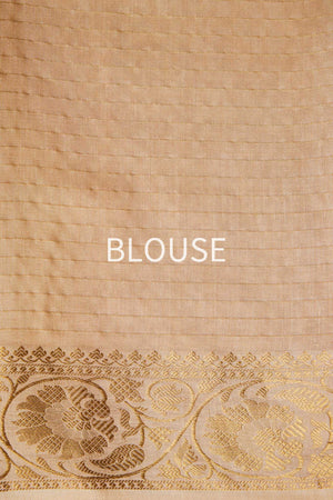 An elegant beige Banarasi moonga silk saree woven in chaukdi pattern.