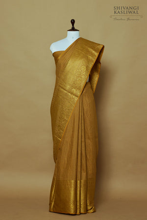 Dark mustard yellow Banarasi moonga silk saree woven in chaukdi pattern.