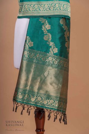 An elegant rama green Banarasi silk dupatta in floral diagonal (arra) design.