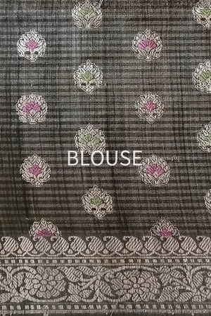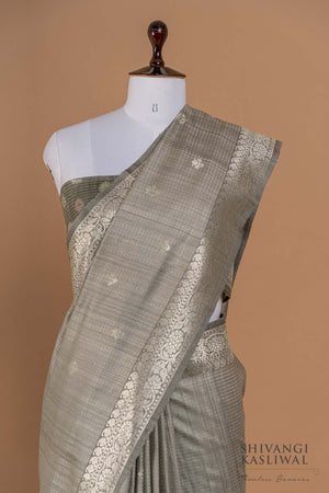 An elegant grey Banarasi dupion silk saree with allover butis in silver zari.
