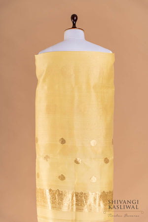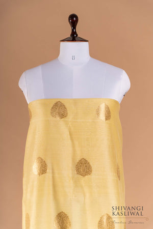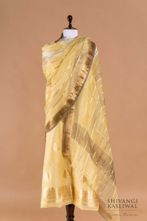 Handwoven suit piece in katan silk with woven floral butas in the kurta accompanied with a matching floral jaal dupatta.