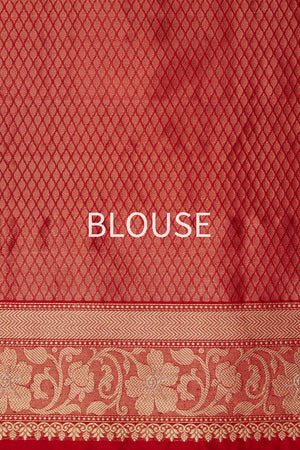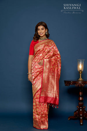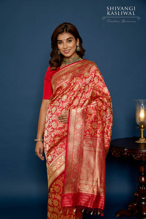 Traditional jangla pattern in rich gold zari topped with soft mina accents, quintessence Banarasi opulence! Handwoven by the finest craftsmen in India using Tanchoi- an incredibly laborious technique that requires one/two colors in warp + multiple colors in weft to attain a seamless self-design on the front & flawless back finish, this is a saree rooted in traditions. Centuries of Banarasi heritage entwined on its fiery red katan silk body, a true gem meant to be treasured for a lifetime & beyond!