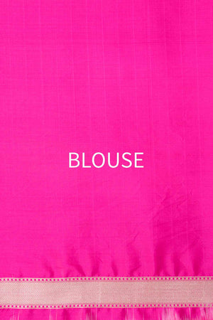 As the gaze travels toward the palla, finely rendered koniamotifs unfold with ceremonial grace, lending the drape a sense of movement and regal depth. The vibrant pink ground amplifies the brilliance of the weave, allowing every detail to emerge with striking clarity and refined intensity.