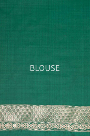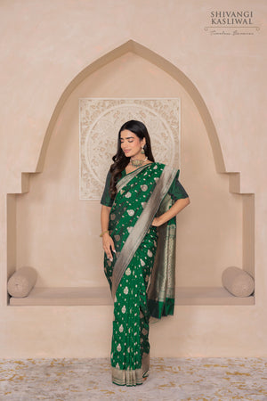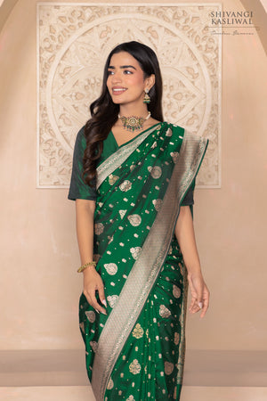 In a deep heritage green, this katan silk saree is adorned with delicate gold zari boota and booti, each woven with exceptional precision. Steeped in Banarasi tradition, its rich hue and intricate detailing exude quiet opulence—a refined classic destined to become a treasured heirloom.