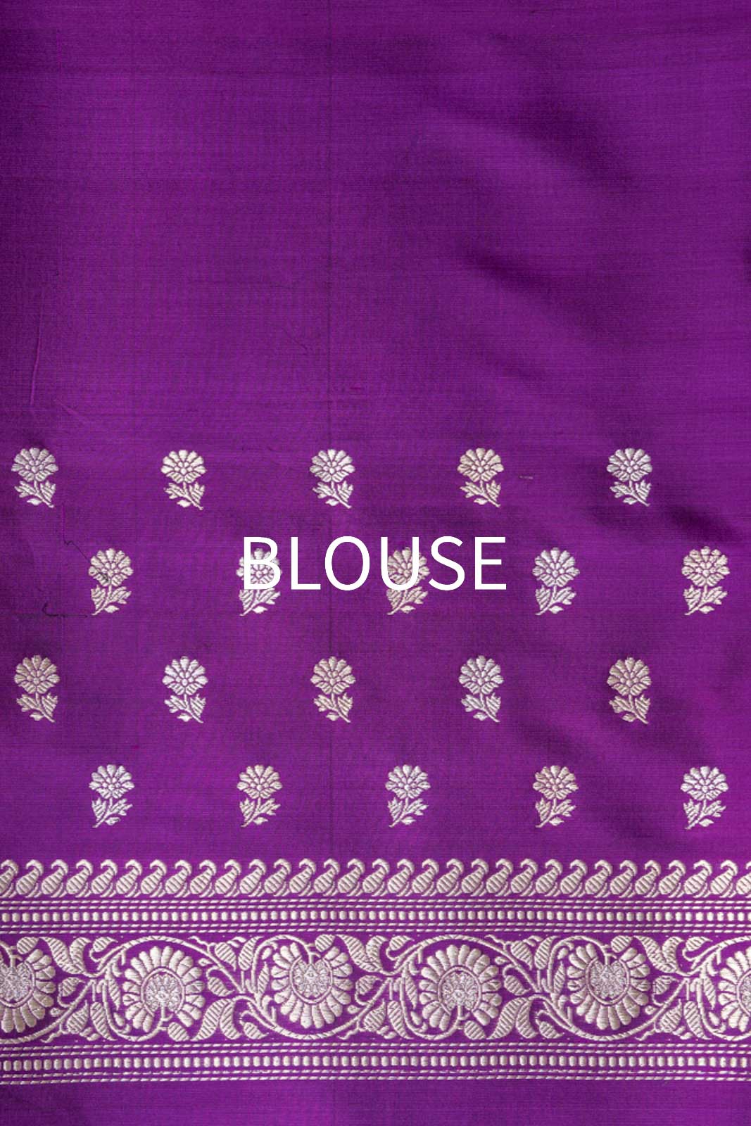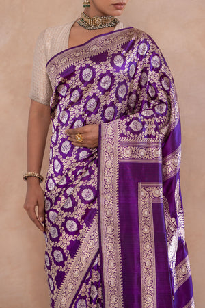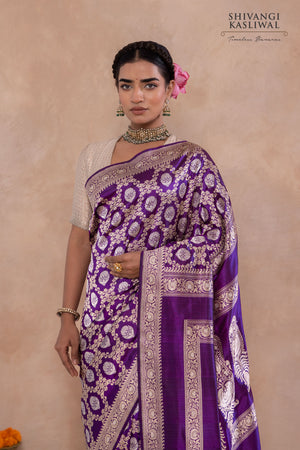 The artistry deepens as the drape flows toward a richly embellished palla, where intricate detailing rises in ceremonial splendor, lending the saree a sense of grandeur and completion. The depth of the purple silk amplifies the radiance of gold and silver, allowing the weave to shimmer with sculptural clarity and regal restraint. Majestic yet composed, this saree is a celebration of classical craftsmanship elevated by thoughtful design—crafted for the discerning connoisseur who seeks heritage woven with authority, refinement, and enduring magnificence.