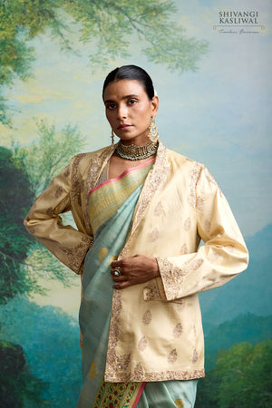• Elevate your collection with our Powder Blue Banarasi Saree, crafted from soft tussar georgette for a stunning drape. Meticulously woven using the kadhua technique and adorned with gold zari butas, this saree features a striking Paithani border that seamlessly blends traditional artistry with modern elegance. Perfect for festive occasions or refined events, it promises to make a memorable statement with its timeless charm and exquisite craftsmanship.