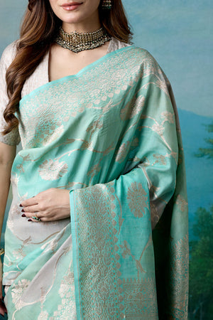 Immerse yourself in the serene beauty of our Shaded Blue Banarasi Saree, expertly crafted from rich tussar georgette. The saree is intricately woven using the cutwork technique and adorned with shimmering gold zari, creating a look of opulent refinement.
