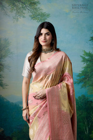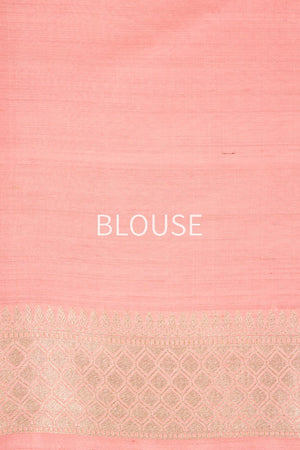 Elevate your style with the exquisite charm of our Shaded Pink Banarasi Saree, crafted from luxurious tussar georgette. Woven with the finest cutwork technique and embellished with rich gold zari, this saree exudes an air of refined grandeur.