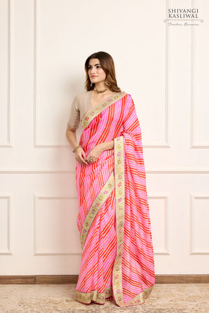 Experience the fusion of heritage artistry and contemporary fashion with this one-of-a-kind saree! A mesmerizing blend of red rani pink Leheriya on soft and supple organza, it stands as a hand-spun tribute to the kaarigar’s time-honored legacy and rich Indian sartorial culture. Crafted to be cherished for years, this Leheriya saree reimagines the grandeur of the past in a modern light. Adorned with a woven Banarasi border featuring exquisite bird motifs, it adds a touch of intricate beauty and tradition. Perfect for women who adore classic and cheerful elegance, it promises to grow more enchanting with every wear, making it an ideal choice for special celebrations.