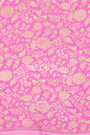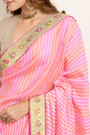 This weightless and whimsical masterpiece perfectly embodies timeless elegance and captivating charm. The mesmerizing blend of peach and pink Leheriya on Italian organza silk is a hand-spun tribute to the rich legacy of skilled artisans and Indian sartorial heritage. Adorned with a woven Banarasi border featuring exquisite bird motifs, it adds a touch of intricate beauty and tradition.