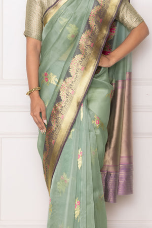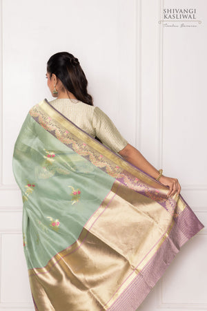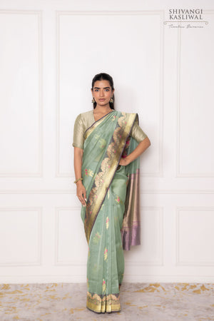 Breathe in the serenity of this exquisite tiffany blue Banarasi organza saree—a delicate fusion of lightness and luxury. Woven from fine organza silk, it drapes with airy grace, ideal for moments of effortless elegance.