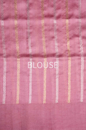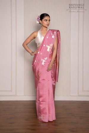 Radiating with timeless beauty, this pink pure silk saree is a masterpiece of craftsmanship and elegance. The lustrous fabric is adorned with delicate butis in gold and silver zari, creating an intricate tapestry that shimmers with every movement. The satin border, embellished with graceful deer motifs, adds a touch of nature’s elegance, while the traditional kadhua weave enhances the rich texture. Perfect for those who appreciate refined artistry, this saree blends classic charm with a unique, captivating allure.