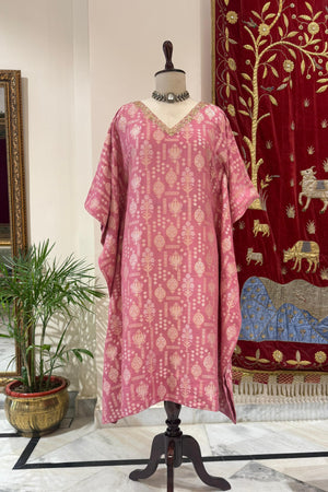 Size GuideIn a tender shade of pink, this Banarasi moonga silk kaftan exudes luminous elegance. The handwoven floral bootas in gold and silver zari lend a soft, regal glow, beautifully complemented by delicate dori and sequin work that adds a touch of festive sparkle. Paired with a fluid silk palazzo, the ensemble strikes the perfect balance of tradition and contemporary charm—ideal for weddings, celebrations, and refined evening occasions. A timeless expression of graceful luxury.