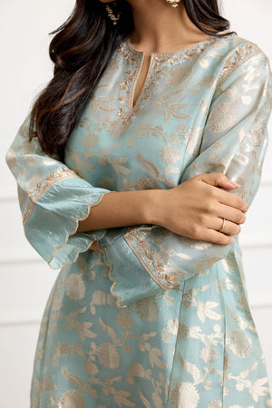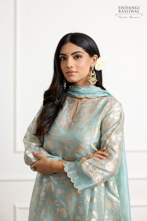 • Immerse yourself in the ethereal charm of our powder blue organza kurta set, made from handwoven Banarasi fabric with a delicate floral jaal design. This A-line kurta with side panels is adorned with intricate aari work, zardozi, and sequins at the neck, armholes, and sleeves. The kurta sleeves and palazzo showcase sequinned blue organza patches with elegant scalloped edges. Completing the ensemble is a soft, scalloped organza dupatta. This monochrome powder blue ensemble epitomizes style and elegance.
