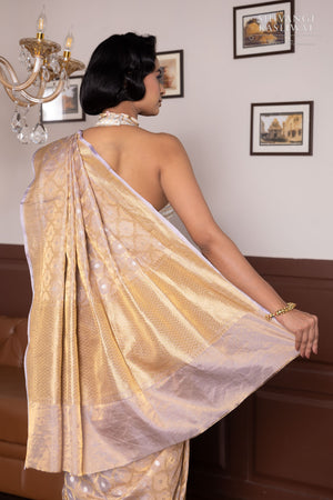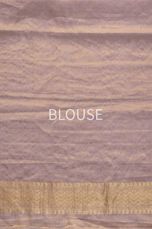A poetic embodiment of regal elegance, this lavender katan tissue silk saree is a sublime symphony of delicacy and grandeur. Crafted from lustrous katan threads interwoven with a sheer tissue finish, it drapes like liquid moonlight—light, luminous, and effortlessly graceful.