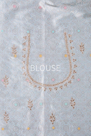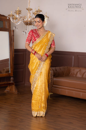 The saree includes an unstitched blouse piece. The model's blouse is for styling only; please refer to the blouse piece image for the actual design.