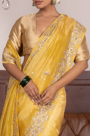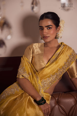 The saree includes an unstitched blouse piece. The model's blouse is for styling only; please refer to the blouse piece image for the actual design.
