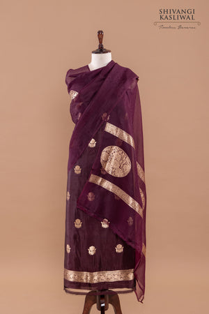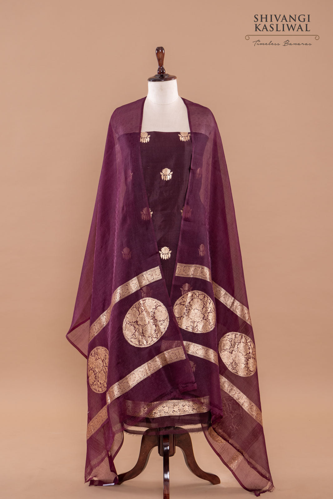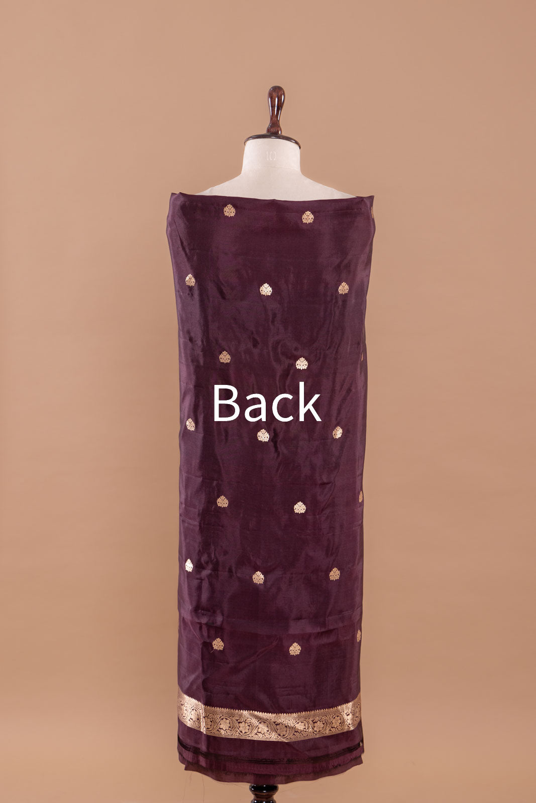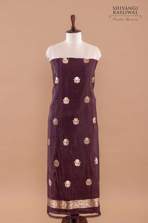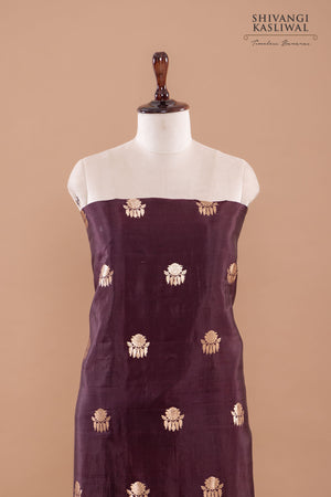 • A sumptuous handwoven suit in a deep brown silk, where the kurta blooms with intricately woven floral boota motifs, imparting a sense of depth and regal artistry. Accompanied by a matching organza dupatta infused with delicate floral elegance, this ensemble unfolds as a portrait of timeless luxury and understated grandeur.